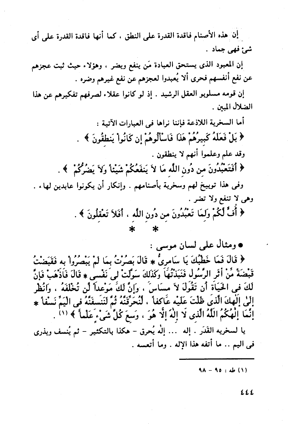 (قَالَ فَمَا خَطْبُكَ يَا سَامِرِيُّ (95) قَالَ بَصُرْتُ بِمَا لَمْ يَبْصُرُوا بِهِ فَقَبَضْتُ قَبْضَةً مِنْ أَثَرِ الرَّسُولِ فَنَبَذْتُهَا وَكَذَلِكَ سَوَّلَتْ لِي نَفْسِي (96) قَالَ فَاذْهَبْ فَإِنَّ لَكَ فِي الْحَيَاةِ أَنْ تَقُولَ لَا مِسَاسَ وَإِنَّ لَكَ مَوْعِدًا لَنْ تُخْلَفَهُ وَانْظُرْ إِلَى إِلَهِكَ الَّذِي ظَلْتَ عَلَيْهِ عَاكِفًا لَنُحَرِّقَنَّهُ ثُمَّ لَنَنْسِفَنَّهُ فِي الْيَمِّ نَسْفًا (97) إِنَّمَا إِلَهُكُمُ اللَّهُ الَّذِي لَا إِلَهَ إِلَّا هُوَ وَسِعَ كُلَّ شَيْءٍ عِلْمًا (98) .