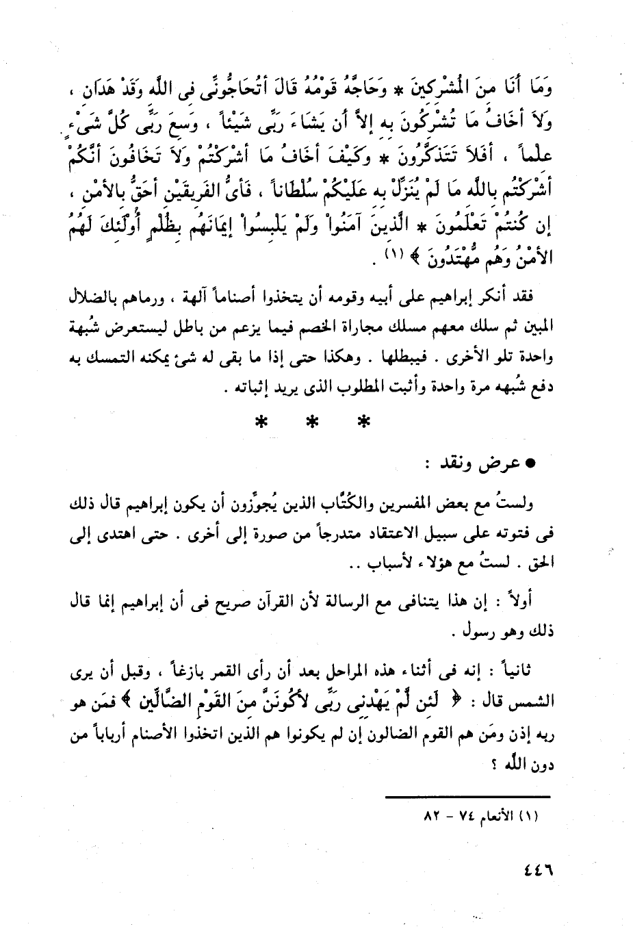ولستُ مع بعض المفسرين والكُتَّاب الذين يُجوِّزون أن يكون إبراهيم قال ذلك فى فتوته على سبيل الاعتقاد متدرجاً من صورة إلى أخرى.