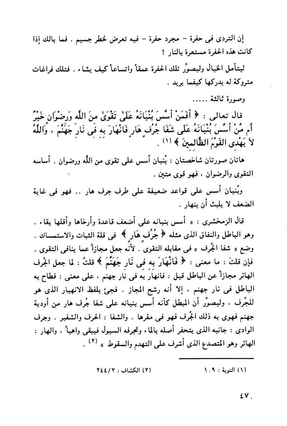 قال تعالى: (أَفَمَنْ أَسَّسَ بُنْيَانَهُ عَلَى تَقْوَى مِنَ اللَّهِ وَرِضْوَانٍ خَيْرٌ أَمْ مَنْ أَسَّسَ بُنْيَانَهُ عَلَى شَفَا جُرُفٍ هَارٍ فَانْهَارَ بِهِ فِي نَارِ جَهَنَّمَ وَاللَّهُ لَا يَهْدِي الْقَوْمَ الظَّالِمِينَ (109) .
