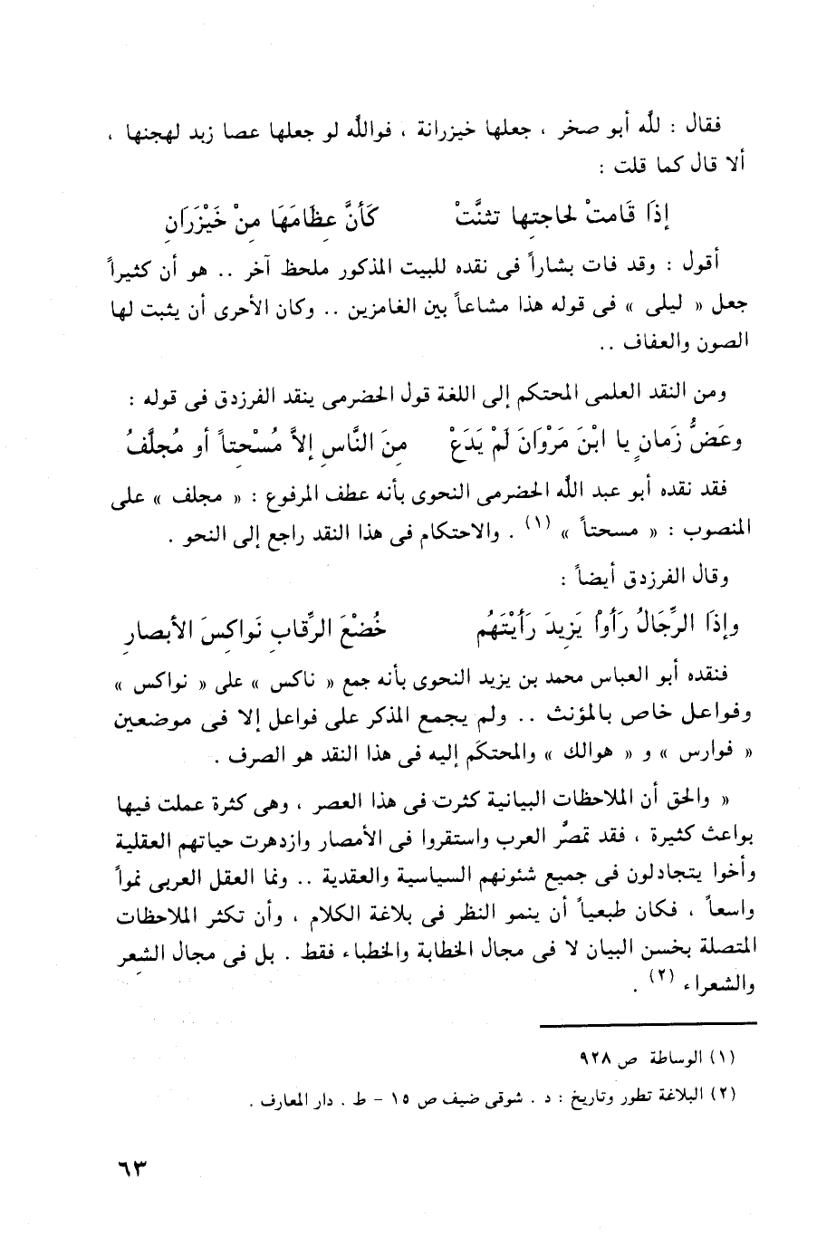 ومن النقد العلمي المحتكم إلى اللغة قول الحضرمى ينقد الفرزدق في قوله: