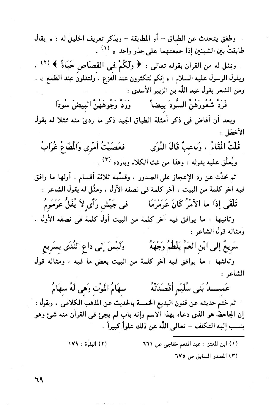وطفق يتحدث عن الطباق - أو المطابقة - ويذكر تعريف الخليل له: " يقال