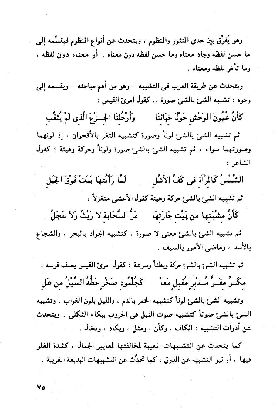 ويتحدث عن طريقة العرب في التشبيه - وهو من أهم مباحثه - ويقسمه إلى