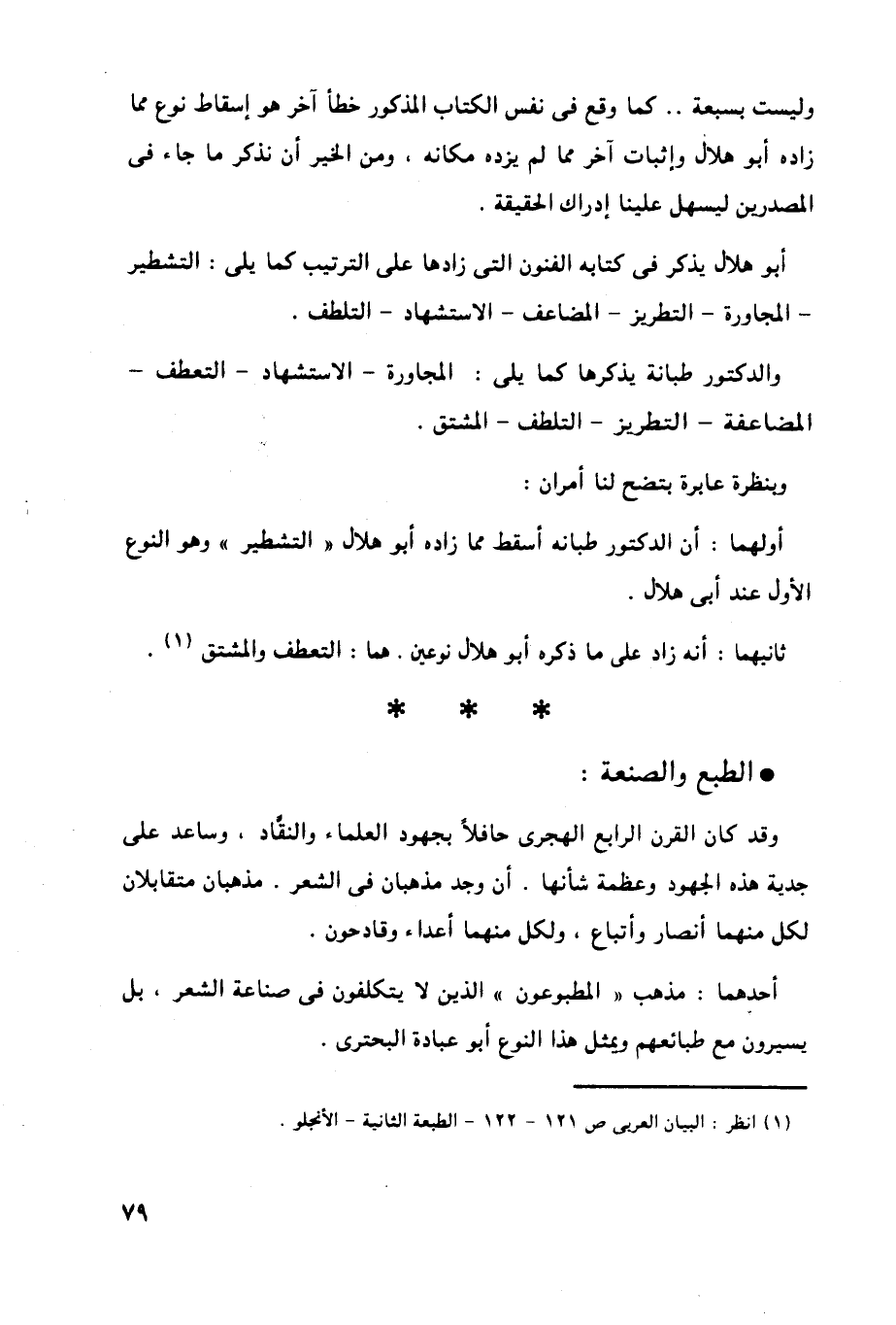 أولهما: أن الدكتور طبانه أسقط مما زاده أبو هلال " التشطير " وهو النوع