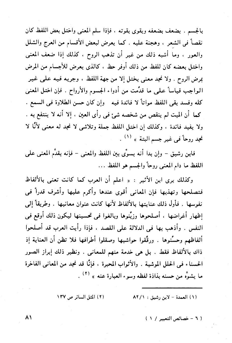 فابن رشيق - وإن بدا أنه يسوى بين اللفظ والمعنى - فإنه يقدم المعنى على