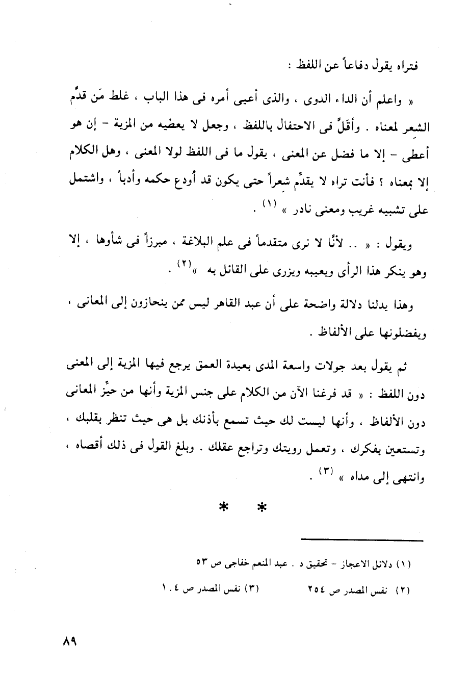 ثم يقول بعد جولات واسعة المدى بعيدة العمق يرجع فيها المزية إلى المعنى