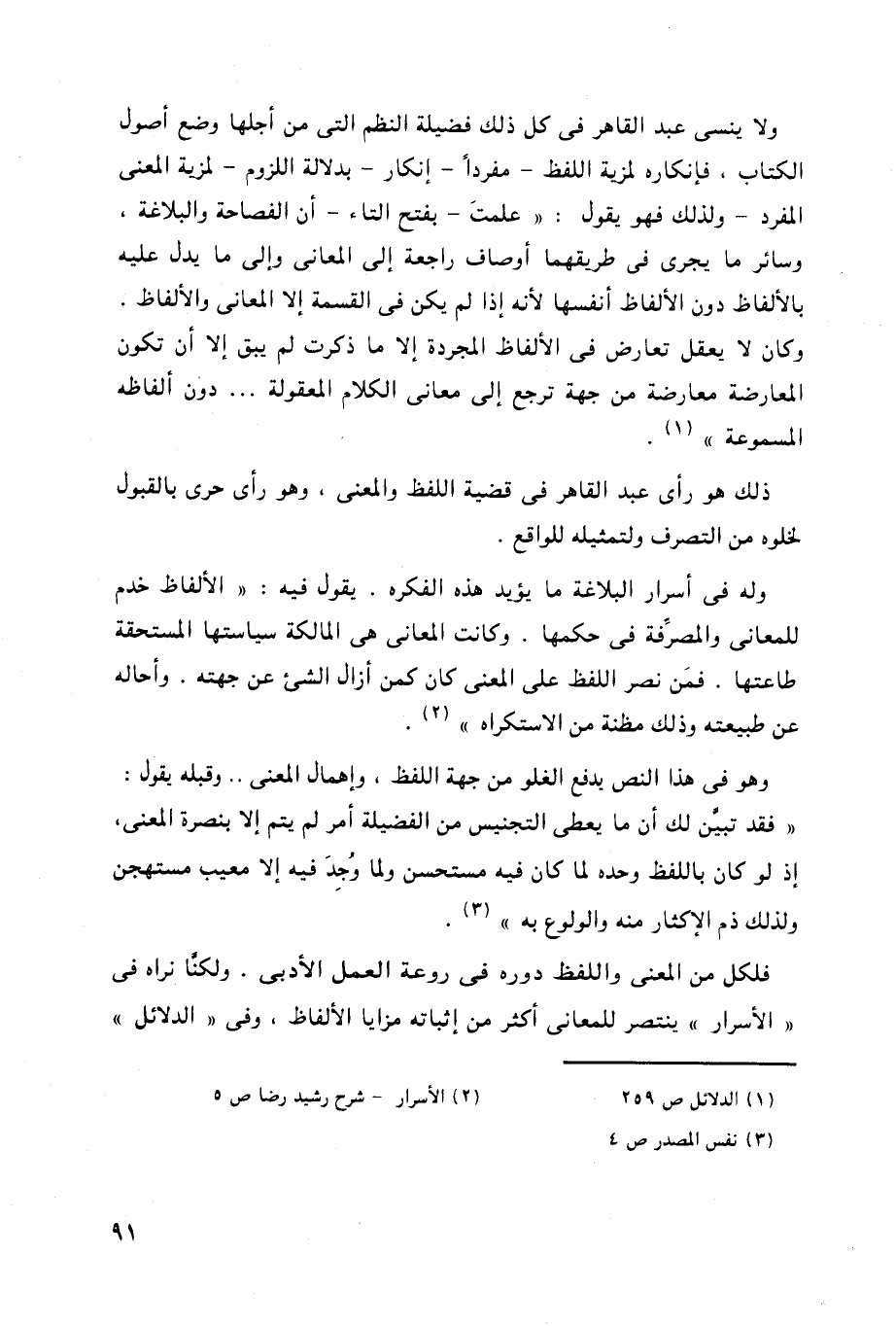 ولكنا نراه فى " الأسرار " ينتصر للمعاني أكثر من إِثباته مزايا الألفاظ، وفي " الدلائل "