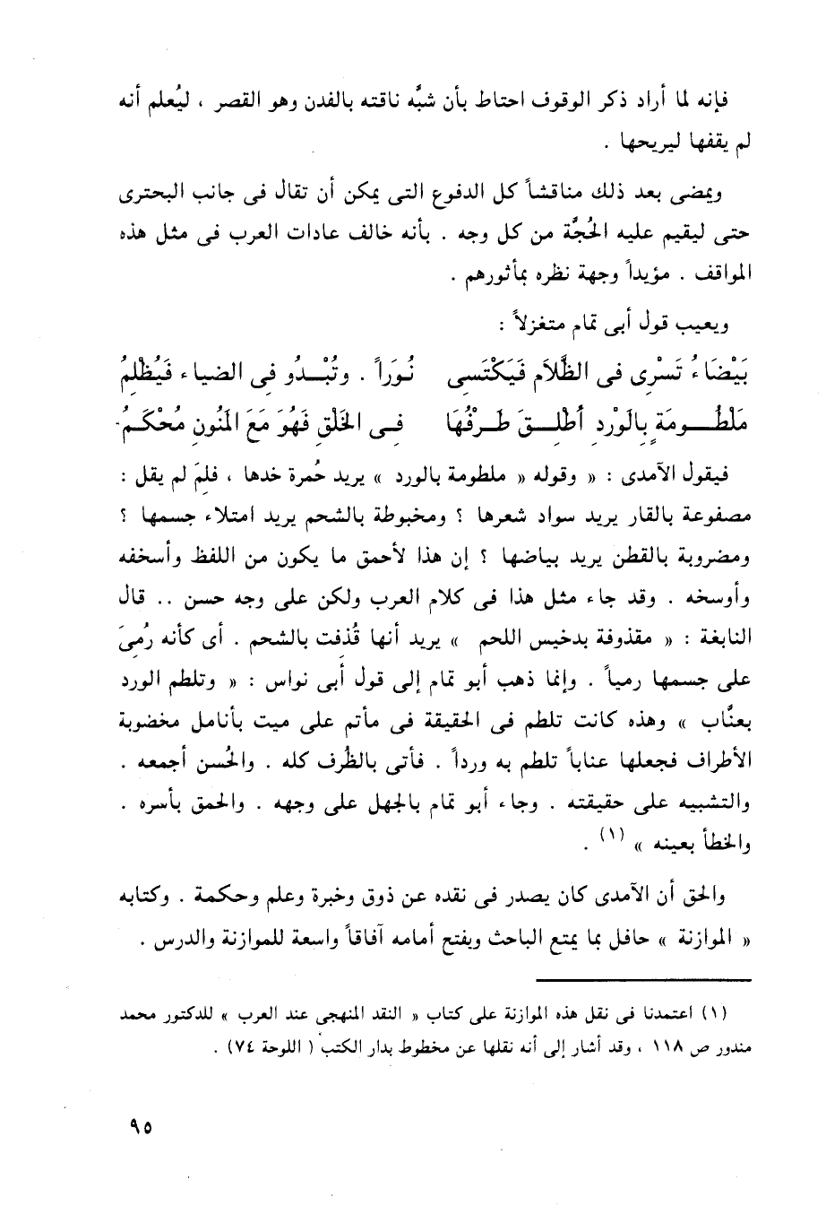 والحق أن الآمدى كان يصدر في نقده عن ذوق وخبرة وعلم وحكمة. وكتابه " الموازنة " حافل بما يمتع الباحث ويفتح أمامه آفاقاً واسعة للموازنة والدرس.