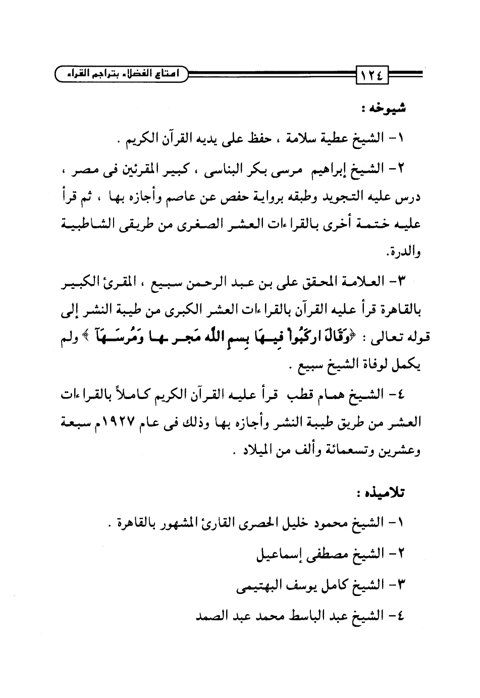 3 - العلامة المحقق علي بن عبد الرحمن سبيع، المقرئ الكبير بالقاهرة قرأ عليه القرآن بالقراءات العشر الكبرى من طيبة النشر إلى قوله تعالى: {وَقَالَ ارْكَبُوا فِيهَا بِسْمِ اللهِ مَجْرَاهَا وَمُرْسَاهَا} ولم يكمل لوفاة الشيخ سبيع.