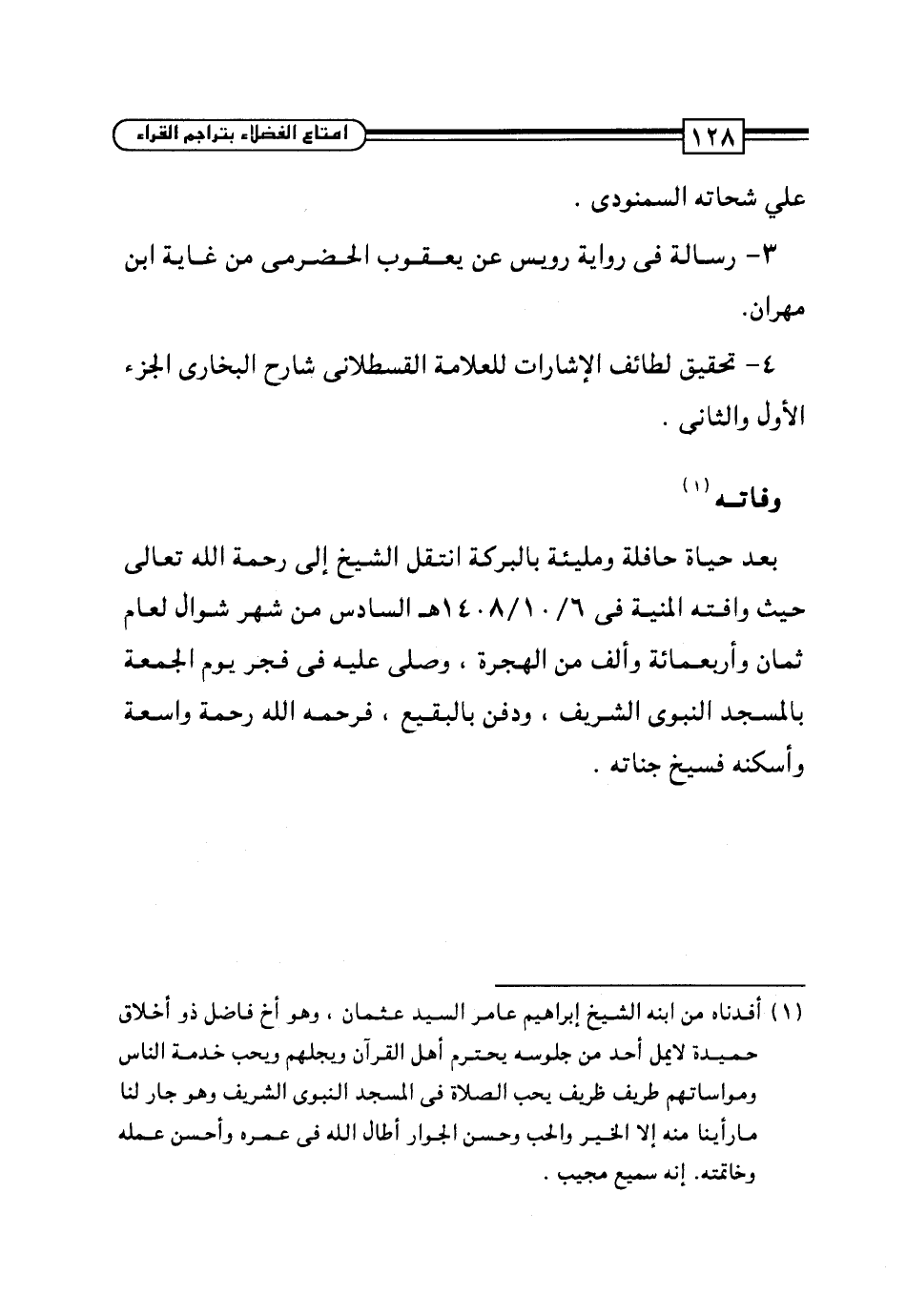 (¬1) أفدناه من ابنه الشيخ إبراهيم عامر السيد عثمان، وهو أخ فاضل ذو أخلاق حميدة لا يمل أحد من جلوسه يحترم أهل القرآن ويجلهم ويحب خدمة الناس ومواساتهم طريف ظريف يحب الصلاة في المسجد النبوى الشريف وهو جار لنا ما رأينا منه إلا الخير والحب وحسن الجوار أطال الله في عمره وأحسن عمله وخاتمته. إنه سميع مجيب.