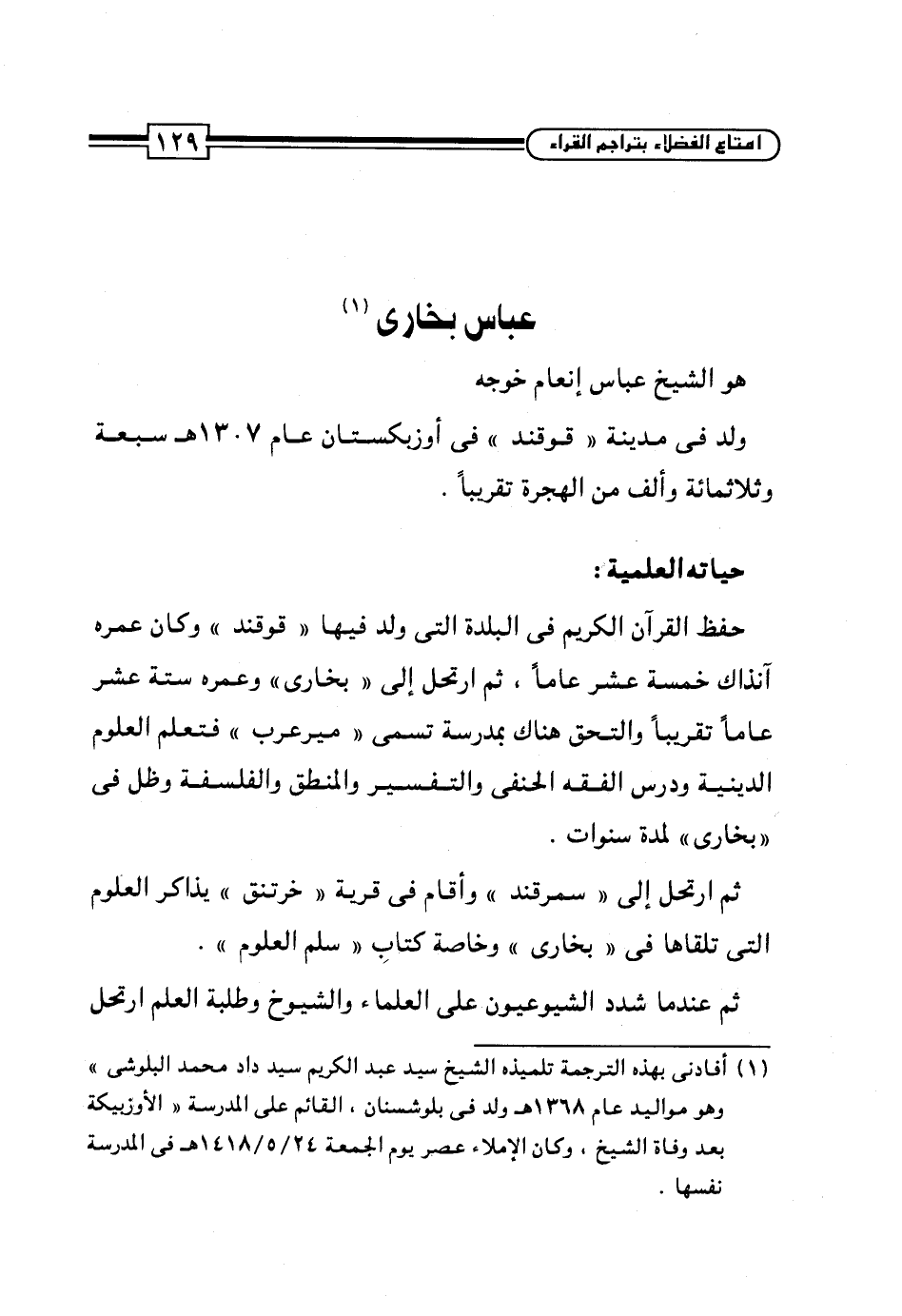 (¬1) أفأدنى بهذه الترجمة تلميذه الشيخ سيد عبد الكريم سيد داد محمَّد البلوشى" وهو مواليد عام 1368 هـ ولد في بلوشسنان، القائم على المدرسة "الأوزبيكة بعد وفاة الشيخ، وكان الإملاء عصر يوم الجمعة 24/ 5/ 1418 هـ في المدرسة نفسها.