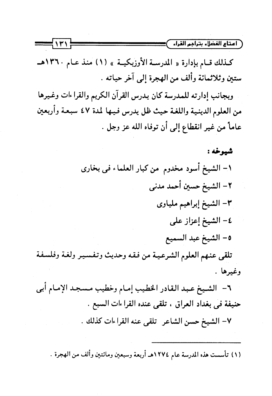 كذلك قام بإدارة "المدرسة الأوزبكية" (¬1) منذ عام 1360 هـ ستين وثلاثمائة وألف من الهجرة إلى آخر حياته.
