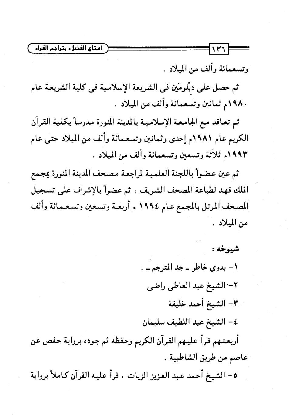 5 - الشيخ أحمد عبد العزيز الزيات، قرأ عليه القرآن كاملاً برواية