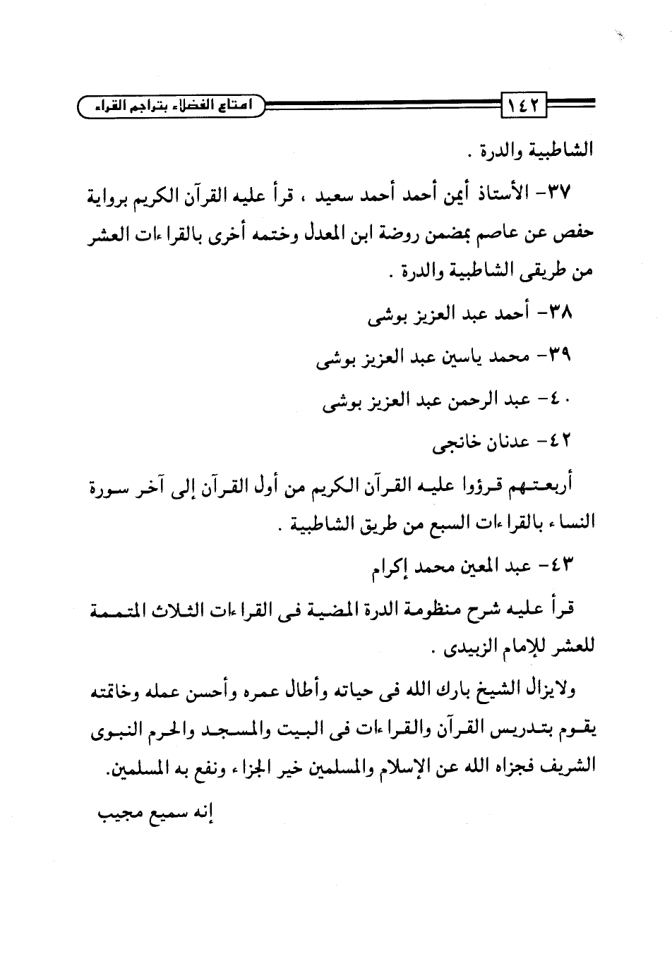 37 - الأستاذ أيمن أحمد أحمد سعيد، قرأ عليه القرآن الكريم برواية حفص عن عاصم بمضمن روضة ابن المعدل وختمه أخرى بالقراءات العشر من طريقي الشاطبية والدرة.