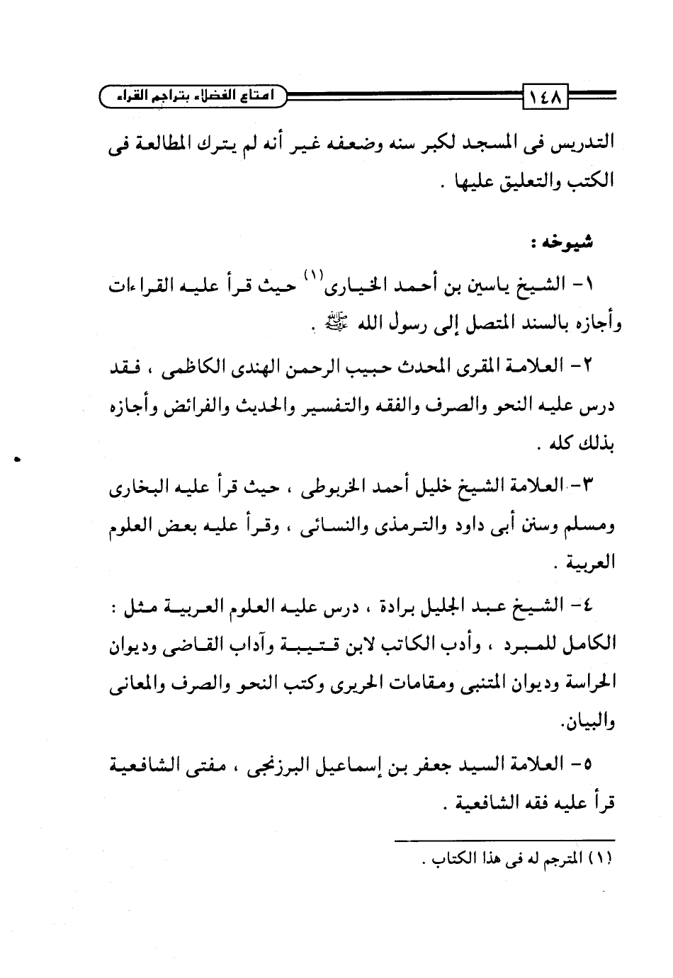 1 - الشيخ ياسين بن أحمد الخيارى (¬1) حيث قرأ عليه القراءات وأجازه بالسند المتصل إلى رسول الله - صلى الله عليه وسلم -.