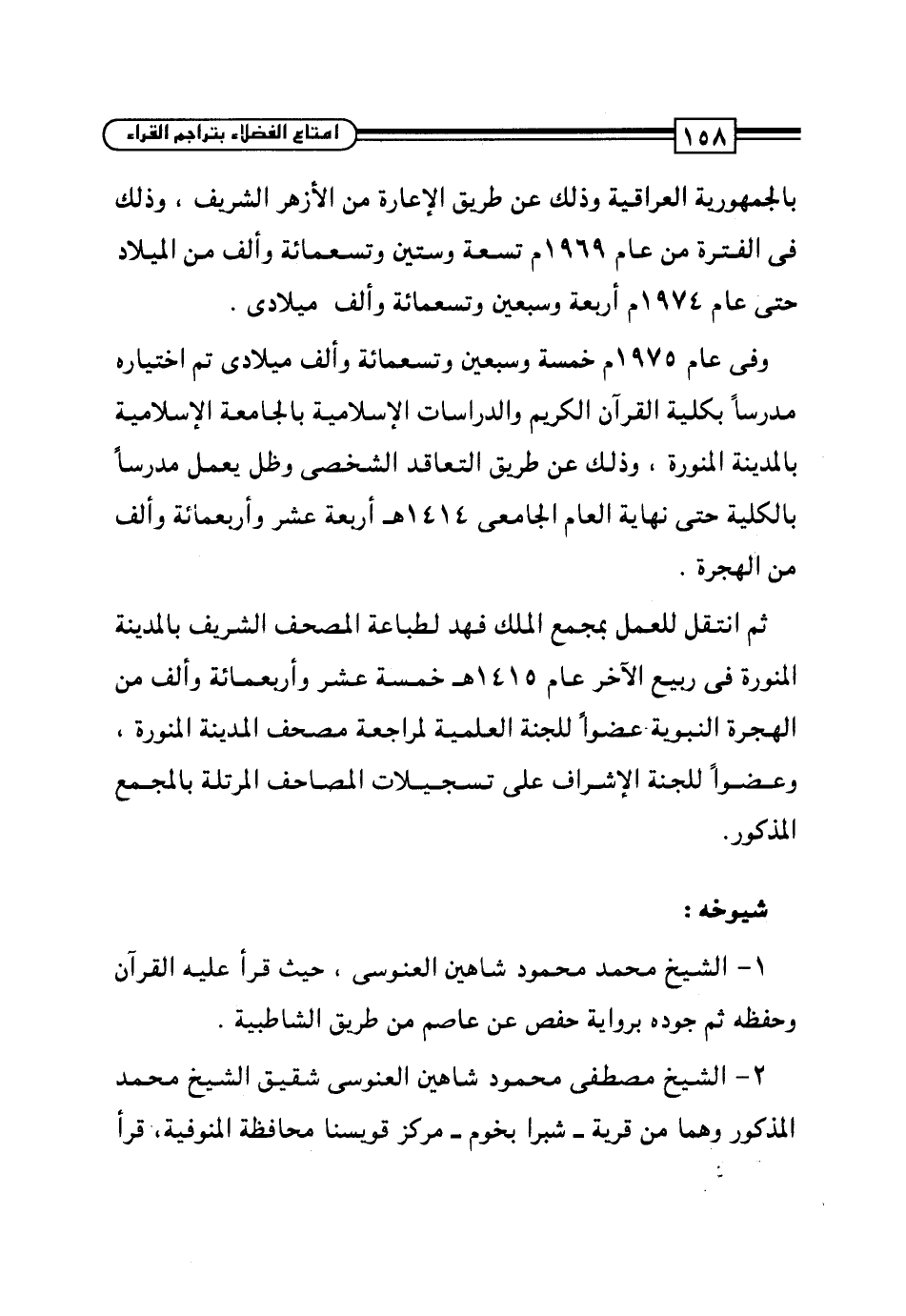 2 - الشيخ مصطفى محمود شاهين العنوسى شقيق الشيخ محمَّد المذكور وهما من قرية -شبرا بخوم- مركز قويسنا محافظة المنوفية، قرأ