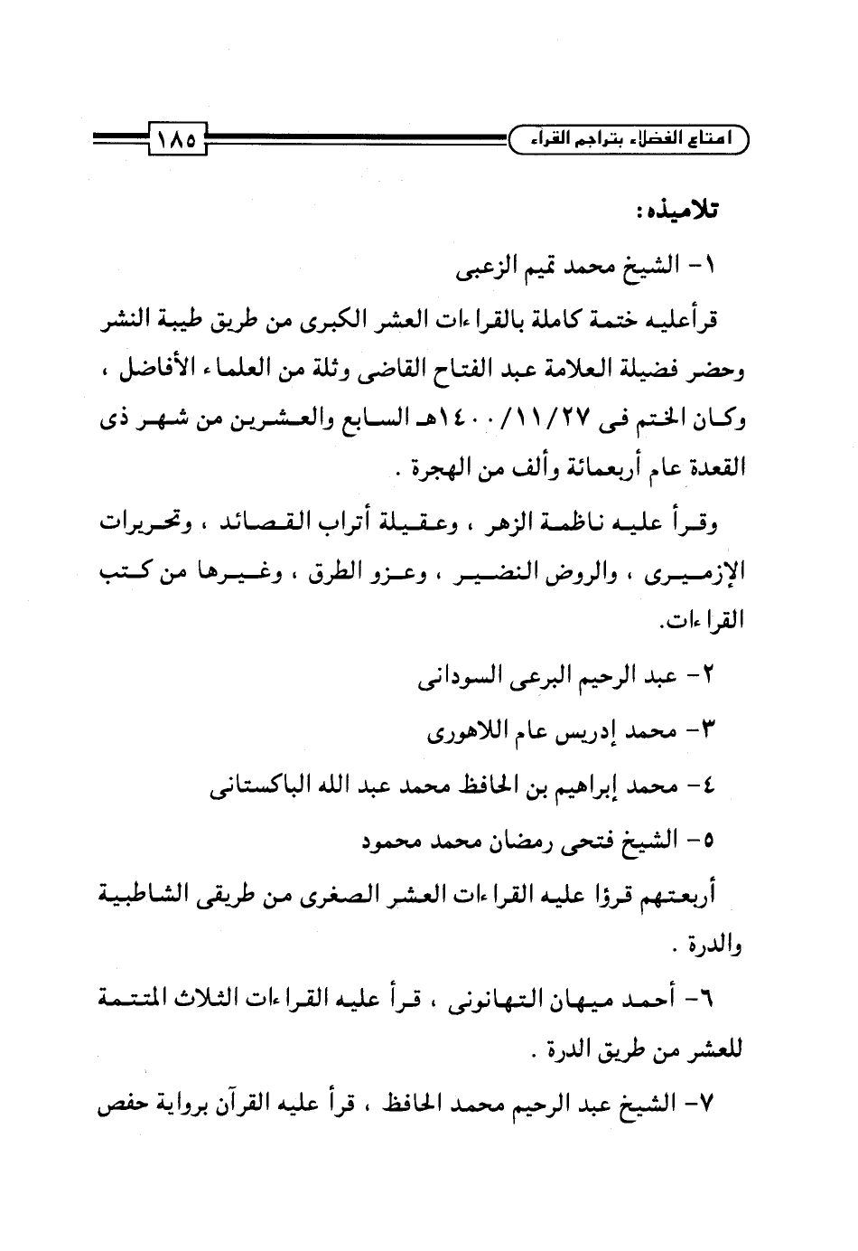 6 - أحمد ميهان التهانوني، قرأ عليه القراءات الثلاث المتممة للعشر من طريق الدرة.