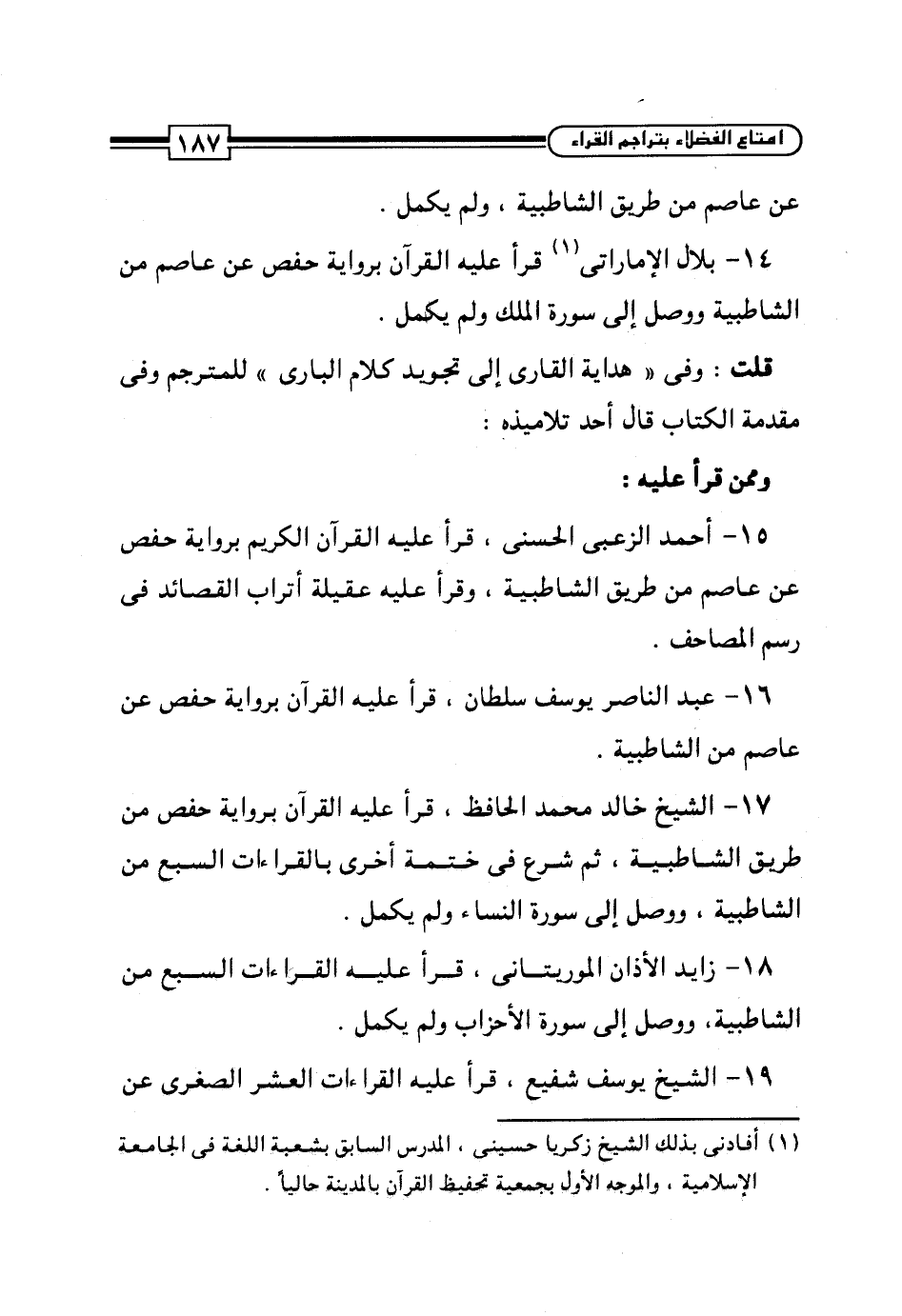 14 - بلال الإماراتي (¬1) قرأ عليه القرآن برواية حفص عن عاصم من الشاطبية ووصل إلى سورة الملك ولم يكمل.
