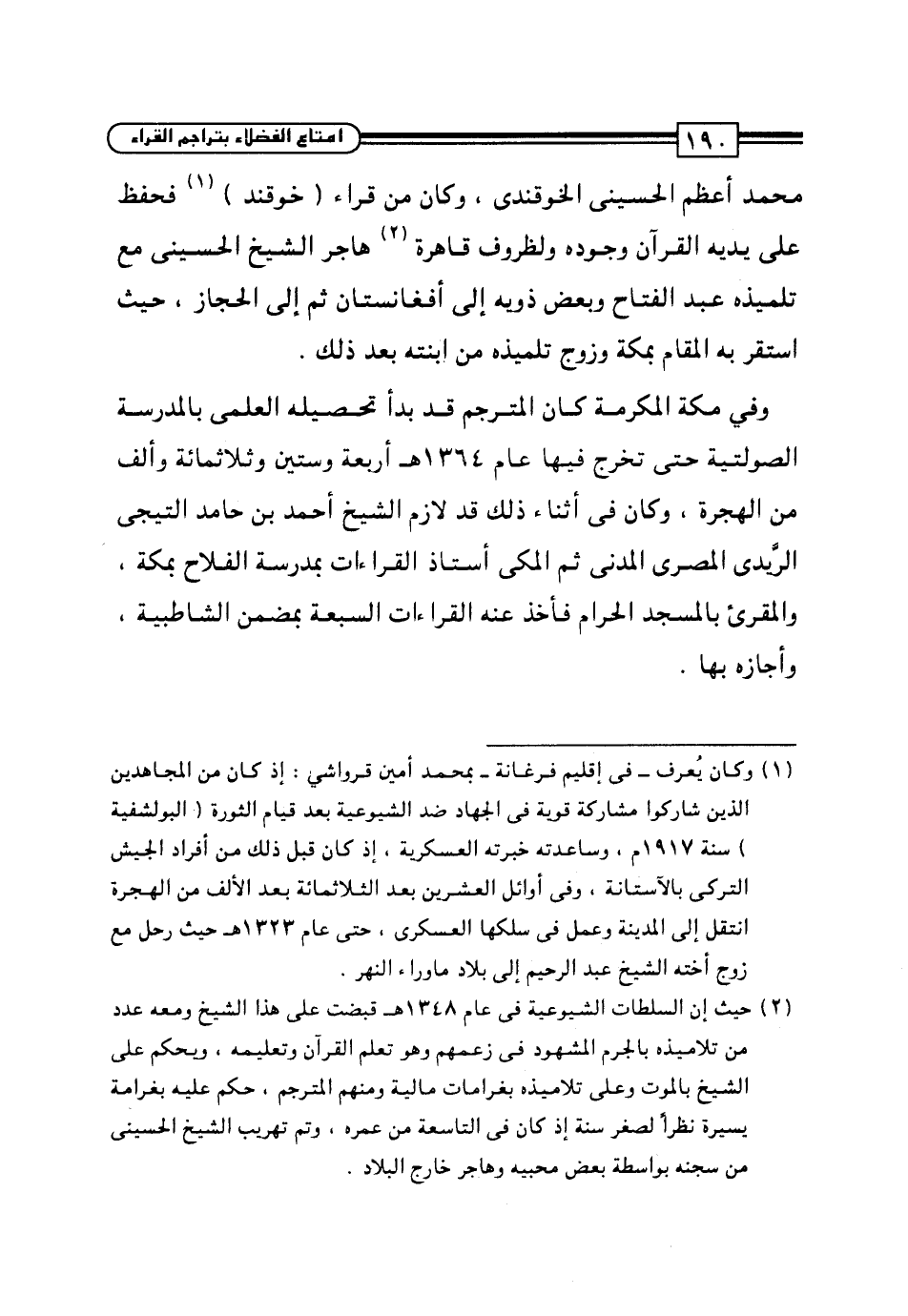 (¬2) حيث إن السلطات الشيوعية في عام 1348هـ قبضت على هذا الشيخ ومعه عدد من تلاميذه بالحرم المشهود في زعمهم وهو تعلم القرآن وتعليمه، ويحكم على الشيخ بالموت وعلى تلاميذه بغرامات مالية ومنهم المترجم، حكم عليه بغرامة يسيرة نظراً لصغر سنة إذ، كان في التاسعة من عمره، وتم تهريب الشيخ الحسينى من سجنه بواسطة بعض محبيه وهاجر خارج البلاد.