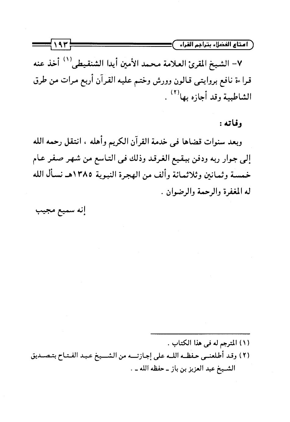 7 - الشيخ المقرئ العلامة محمَّد الأمين أيدا الشنقيطي (¬1) أخذ عنه قراءة نافع بروايتي قالون وورش وختم عليه القرآن أربع مرات من طرق الشاطبية وقد أجازه بها (¬2).