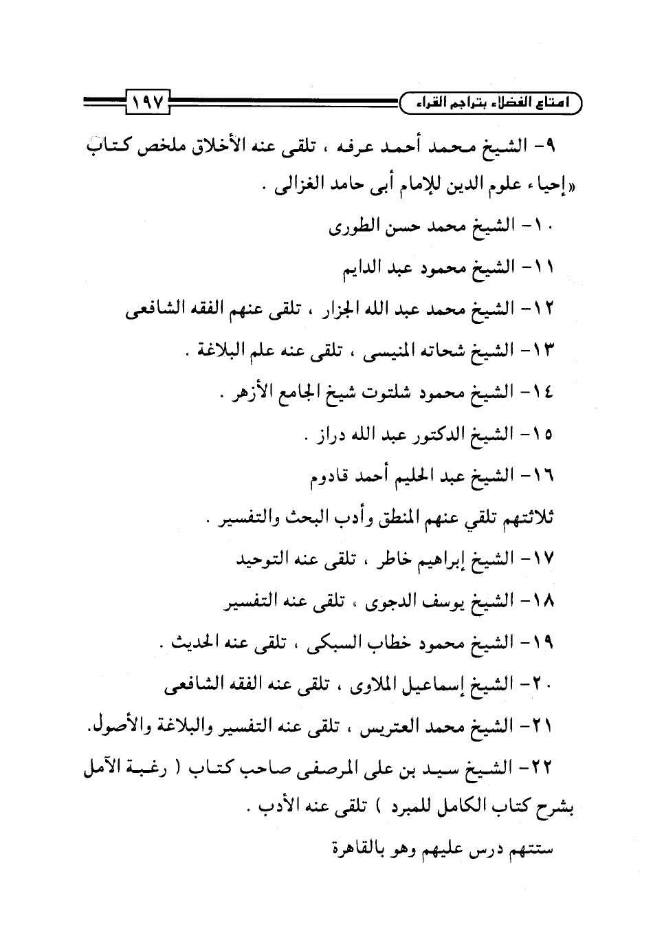 22 - الشيخ سيد بن علي المرصفى صاحب كتاب (رغبة الآمل بشرح كتاب الكامل للمبرد) تلقى عنه الأدب.