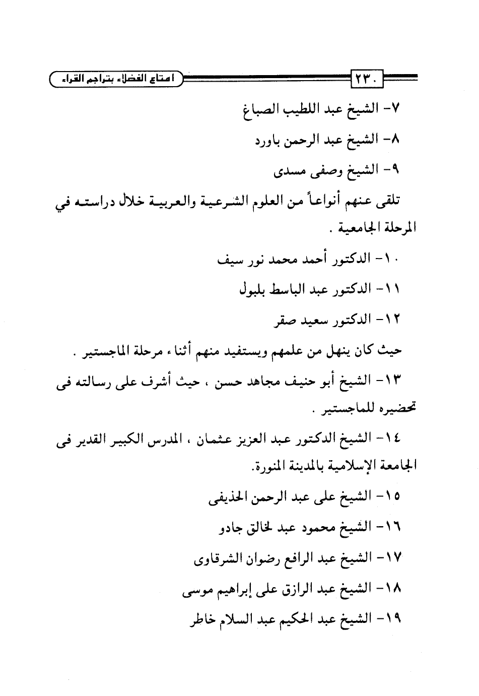 13 - الشيخ أبو حنيف مجاهد حسن، حيث أشرف على رسالته في تحضيره للماجستير.