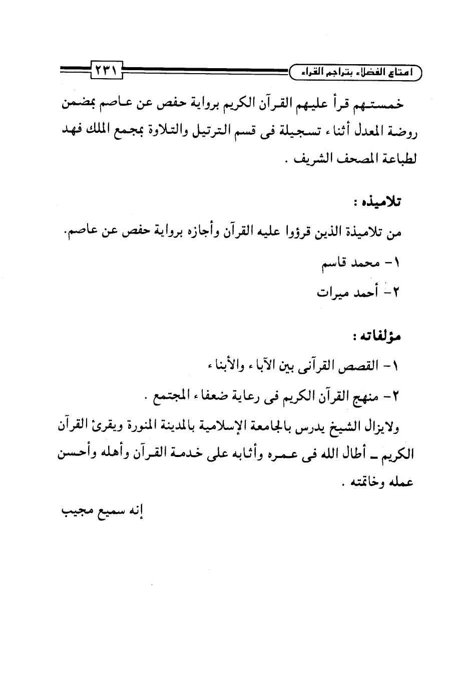 من تلاميذه الذين قرؤوا عليه القرآن وأجازه برواية حفص عن عاصم.