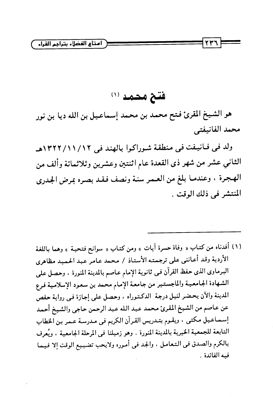 (¬1) أفدناه من كتاب "وفاة حسرة آيات" ومن كتاب "سوانح فتحية" وهما باللغة الأردية وقد أعاننى على ترجمته الأستاذ/ محمَّد عامر عبد الحميد مظاهرى البرماوي الذي حفظ القرآن في ثانوية الإِمام عاصم بالمدينة المنورة، وحصل على الشهادة الجامعية والماجستير من جامعة الإِمام محمَّد بن سعود الإِسلامية فرع المدينة والآن يحضر لنيل درجة الدكتوراه، وحصل على إجازة في رواية حفص عن عاصم من الشيخ المقرئ محمَّد عبد الله عبد الرحمن حاجى والشيخ أحمد إسماعيل مكتي، ويقوم بتدريس القرآن الكريم في مدرسة عمر بن الخطاب التابعة للجمعية الخيرية بالمدينة المنورة. وهو زميلنا في المرحلة الجامعية، ويُعرف بالكرم والصدق في التعامل، والجد في أموره ولا يحب تضييع الوقت إلا فيما فيه الفائدة.