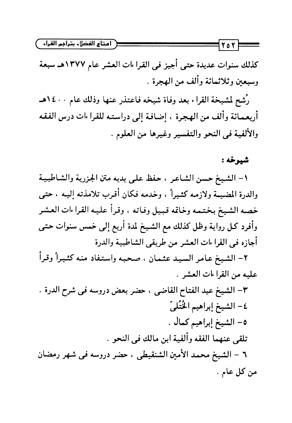كذلك سنوات عديدة حتى أجيز في القراءات العشر عام 1377هـ سبعة وسبعين وثلاثمائة وألف من الهجرة.