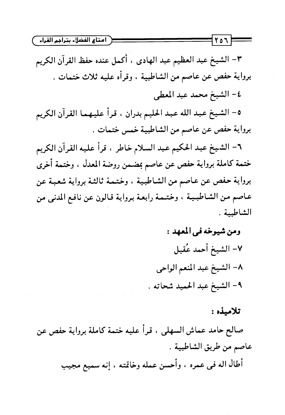 5 - الشيخ عبد الله عبد الحليم بدران، قرأ عليهما القرآن الكريم برواية حفص عن عاصم من الشاطبية خمس ختمات.