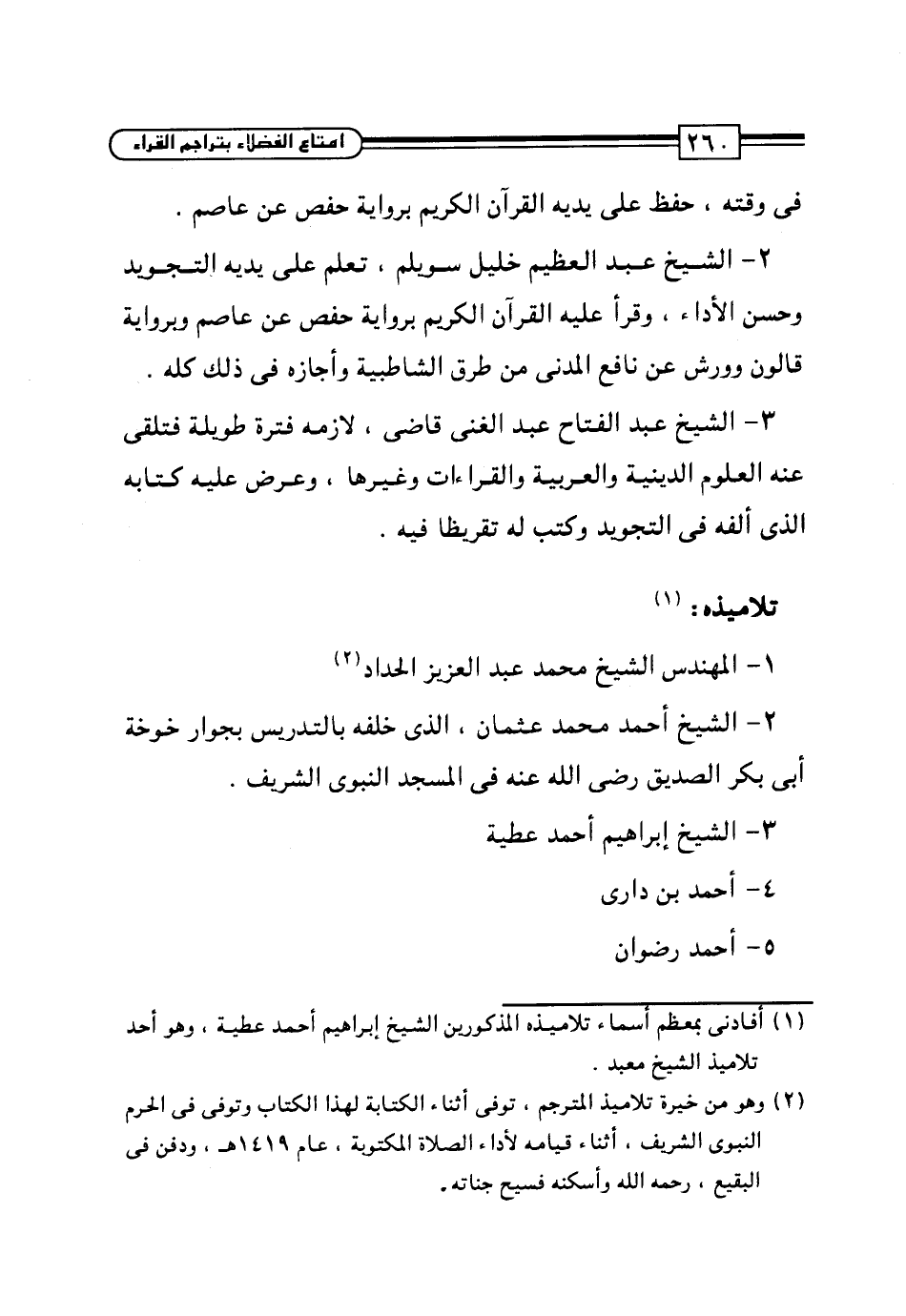 (¬2) وهو من خيرة تلاميذ المترجم، توفي أثناء الكتابة لهذا الكتاب وتوفى في الحرم النبوى الشريف، أثناء قيامه لأداء الصلاة المكتوبة، عام 1419هـ، ودفن في البقيع، رحمه الله وأسكنه فسيح جناته.