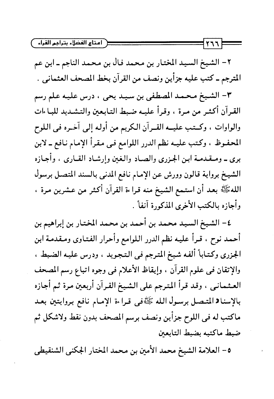 4 - الشيخ السيد محمَّد بن أحمد بن محمَّد المختار بن إبراهيم بن أحمد نوح، قرأ عليه نظم الدرر اللوامع وأحرار الفتاوى ومقدمة ابن الجزرى وكتاباً ألفه شيخ المترجم في التجويد، ودرس عليه الضبط، والإتقان في علوم القرآن، وإيقاظ الأعلام في وجوه اتباع رسم المصحف العثمانى، وقد قرأ المترجم على الشيخ القرآن أربعين مرة ثم أجازه بالإسناد المتصل برسول الله - صلى الله عليه وسلم - في قراءة الإِمام نافع بروايتين بعد ما كتب له في اللوح جزأين ونصف برسم المصحف بدون نقط ولا شكل ثم ضبط ما كتبه بضبط التابعين