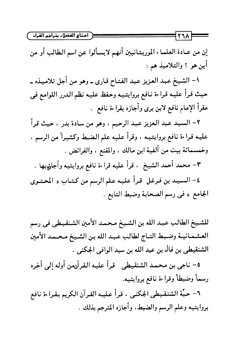5 - ناجى بن محمَّد الشنقيطى قرأ عليه القرآن من أوله إلى آخره رسماً وضبطاً وقراءة نافع بروايتيه.
