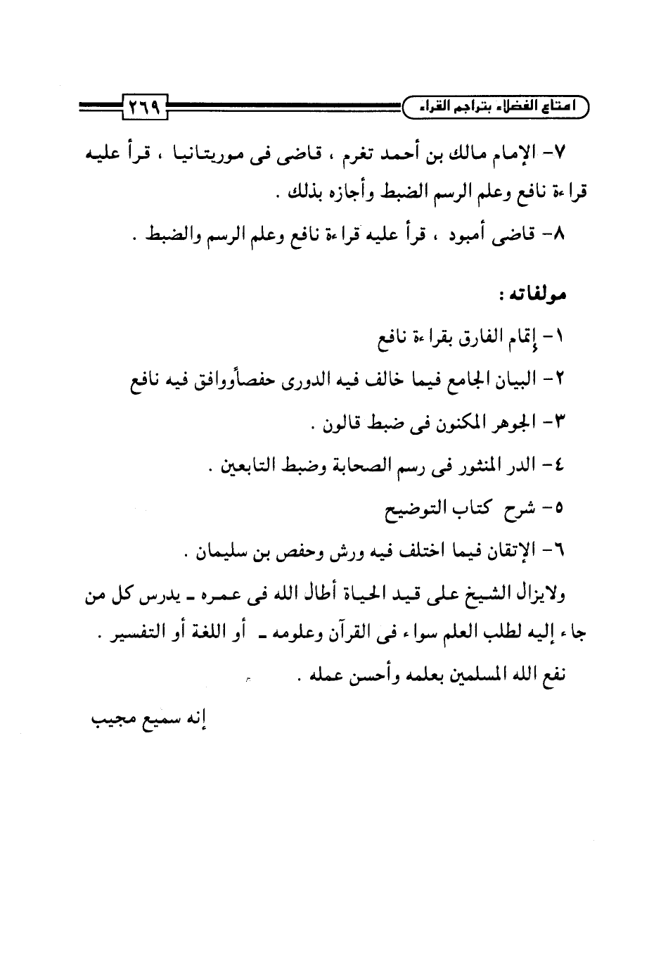 7 - الإِمام مالك بن أحمد تغرم، قاضى في موريتانيا, قرأ عليه قراءة نافع وعلم الرسم الضبط وأجازه بذلك.