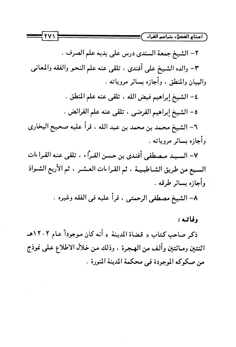 7 - السيد مصطفى أفندي بن حسن القرَّاء، تلقى عنه القراءات السبع من طريق الشاطبية، ثم القراءات العشر، ثم الأربع الشواذ وأجازه بسائر طرقه.