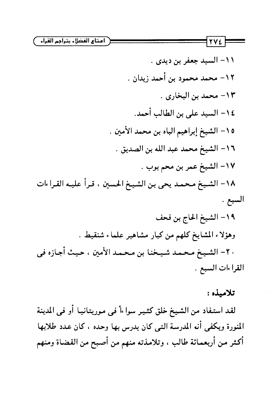 20 - الشيخ محمَّد شيخنا بن محمَّد الأمين، حيث أجازه في القراءات السبع.