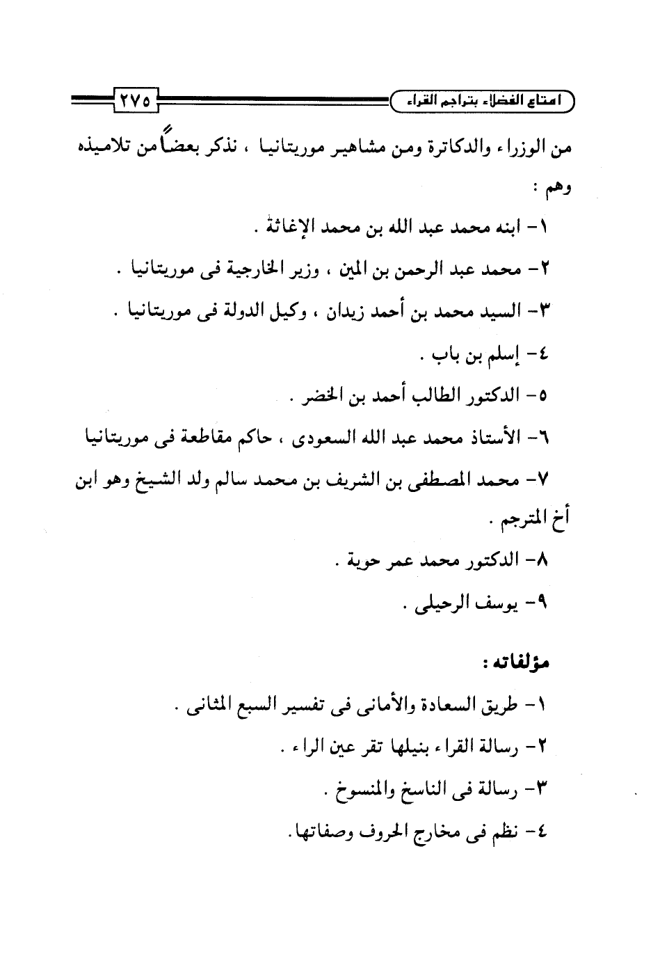 من الوزراء والدكاترة ومن مشاهير موريتانيا، نذكر بعضاً من تلاميذه وهم: