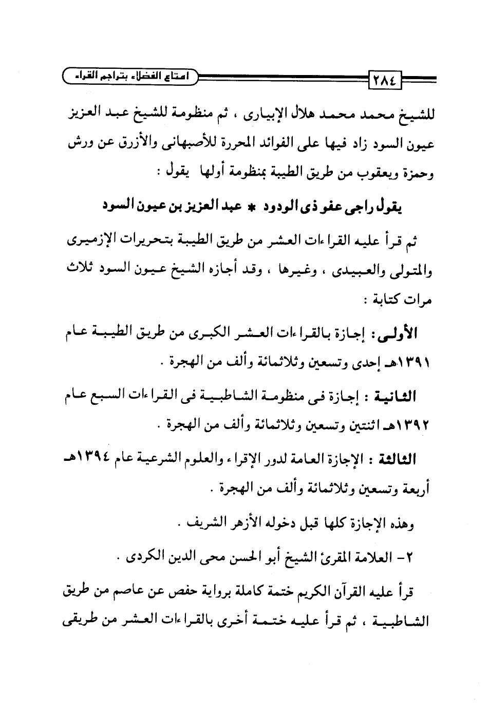 الأولى: إجازة بالقراءات العشر الكبرى من طريق الطيبة عام 1391هـ إحدى وتسعين وثلاثمائة وألف من الهجرة.
