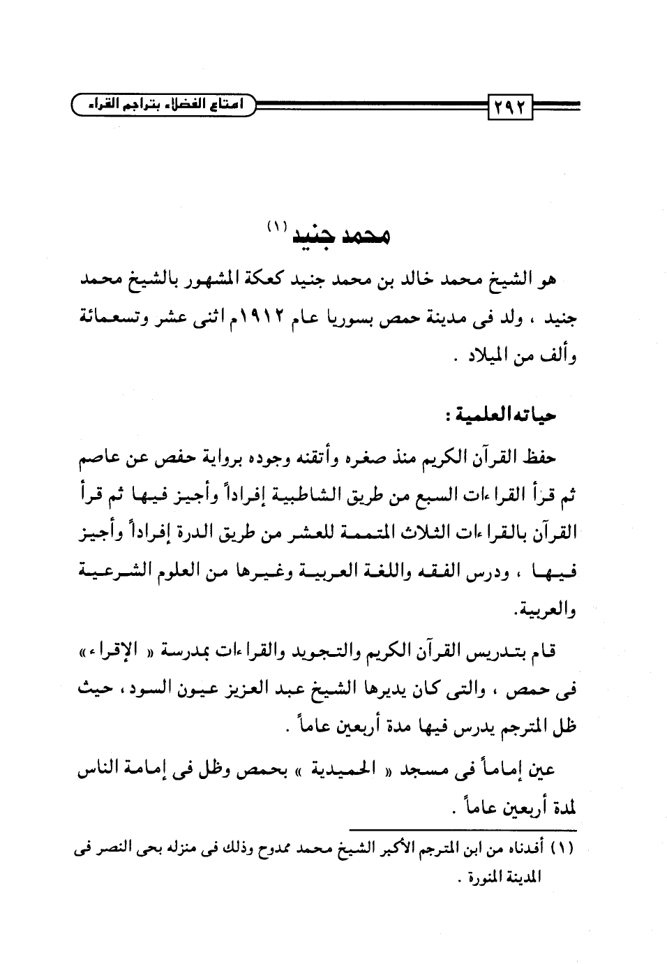 (¬1) أفدناه من ابن المترجم الأكبر الشيخ محمَّد ممدوح وذلك في منزله بحي النصر في المدينة المنورة.