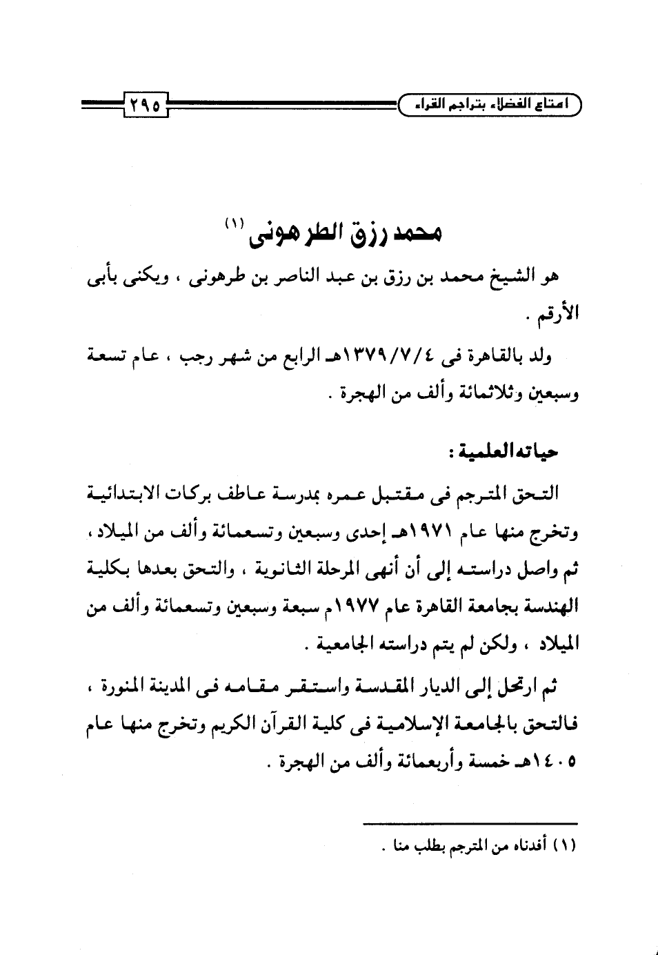 هو الشيخ محمَّد بن رزق بن عبد الناصر بن طرهونى، ويكني بأبي الأرقم.