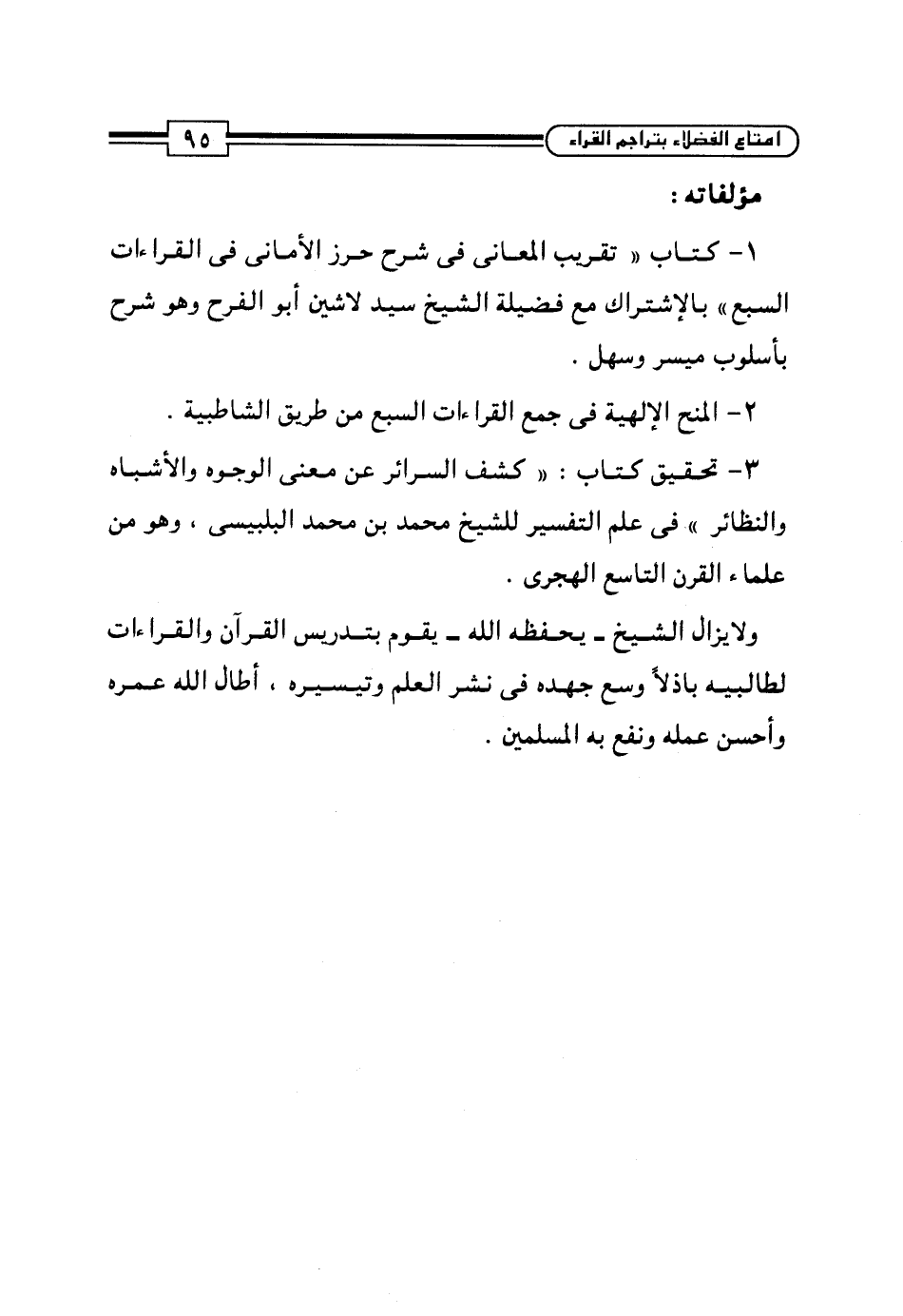 1 - كتاب "تقريب المعانى في شرح حرز الأمانى في القراءات السبع" بالاشتراك مع فضيلة الشيخ سيد لاشين أبو الفرح وهو شرح بأسلوب ميسر وسهل.