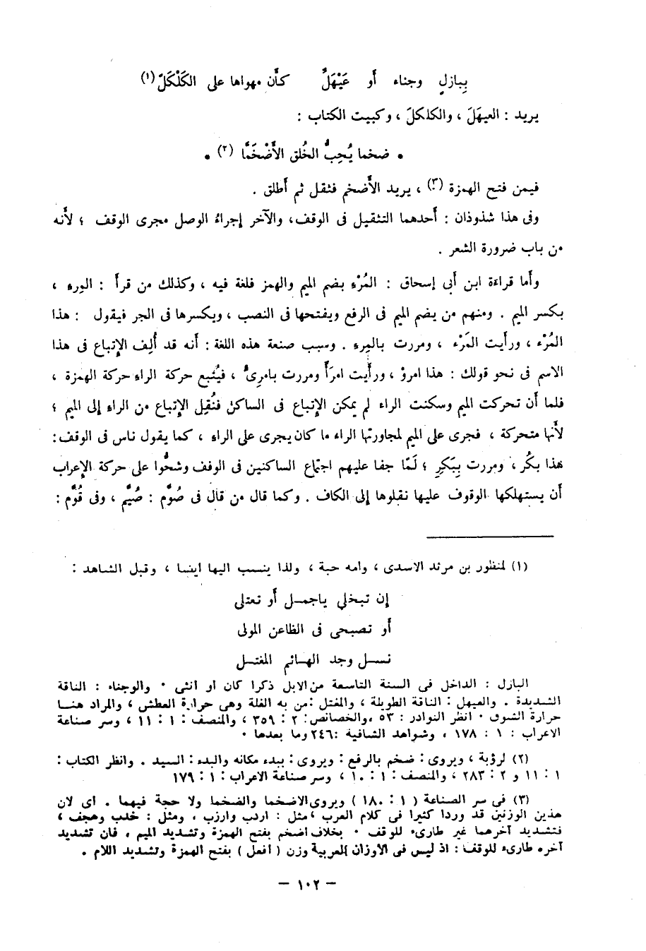 3 في سر الصناعة 1: 180، ويروى: الأضخما والضخما ولا حجة فيهما؛ أي: لأن هذين الوزنين قد وردا كثيرًا في كلام العرب؛ مثل: أردب وأرزب، ومثل: خدب وهجف، فتشديد آخرهما غير طارئ للوقف، بخلاف أضخم بفتح الهمزة وتشديد الميم، فإن تشديد آخره طارئ للوقف؛ إذ ليس في الأوزان العربية وزن "أفعل" بفتح الهمزة وتشديد اللام.
