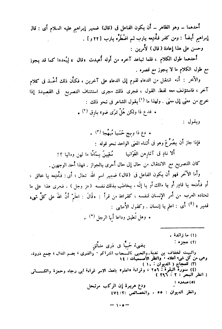 وأما الآخر: فهو أن يكون الفاعل في "قال" ضمير اسم الله تعالى؛ أي: فأَمْتِعه يا خالق، أو فأمتعه يا قادر أو يا مالك أويا إله، يخاطب بذلك نفسه -عز وجل- فجرى هذا على ما تعتاده العرب من أمر الإنسان لنفسه؛ كقراءة من قرأ: "قَالَ اعْلَمْ أَنَّ اللَّهَ عَلَى كُلِّ شَيْءٍ قَدِيرٌ"4 أي: اعلم يا إنسان، وكقول الأعشى:
