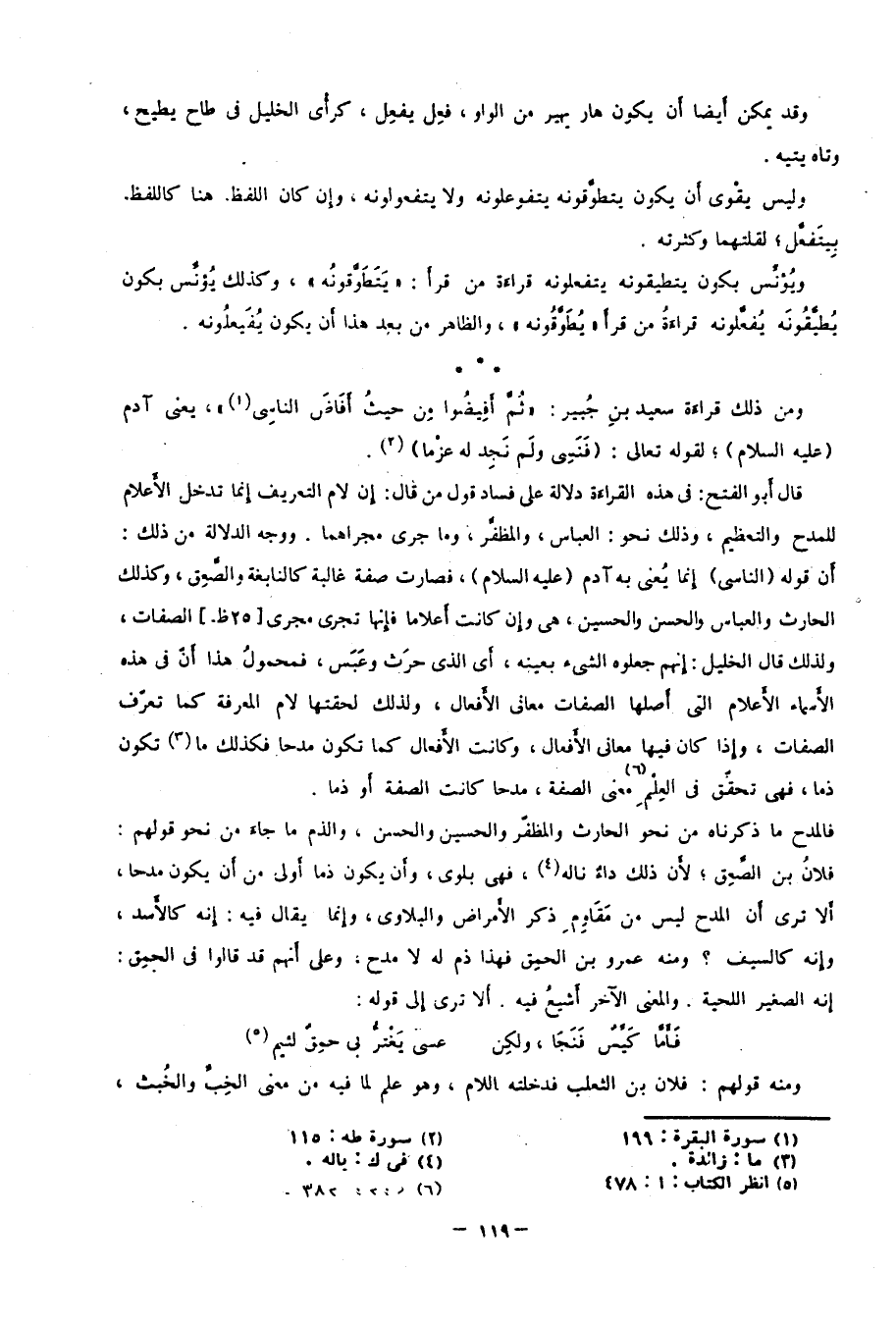 قال أبو الفتح: في هذه القراءة دلالة على فساد قول مَن قال: إن لام التعريف إنما تدخل الأعلام للمدح والتعظيم، وذلك تحو: العباس، والمظفر، وما جرى مجراهما. ووجه الدلالة من ذلك: أن قوله "الناسي" إنما يُعنى به آدم -عليه السلام- فصارت صفة غالبة كالنابغة والصَّعِق، وكذلك الحارث والعباس والحسن والحسين، هي وإن كانت أعلامًا فإنها تجري مجرى "25ظ" الصفات؛ ولذلك قال الخليل: إنهم جعلوه الشيء بعينه؛ أي: الذي حرَث وعَبَسَ، فمحمول هذا أن في هذه الأسماء الأعلام التي أصلها الصفات معاني الأفعال؛ ولذلك لحقتها لام المعرفة كما تعرف الصفات، وإذا كان فيها معاني الأفعال، وكانت الأفعال كما تكون مدحًا فكذلك ما3 تكون ذمًّا، فهي تحقق في العلم معنى الصفة، مدحًا كانت الصفة أو ذمًّا.