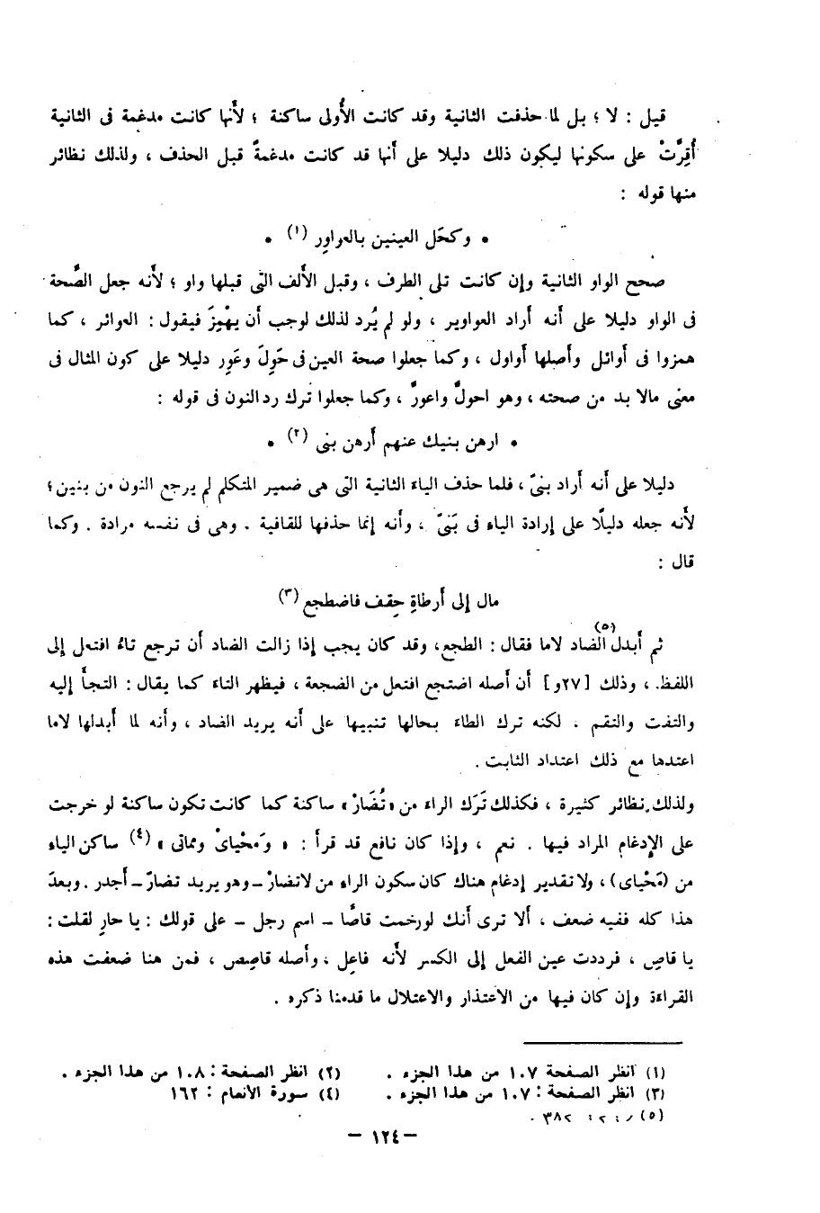 ولذلك نظائر كثيرة، فكذلك ترك الراء من "تُضَارْ"ساكنة كما كانت تكون ساكنة لو خرجت على الإدغام المراد فيها. نعم، وإذا كان نافع قد قرأ: "ومَحْيايْ ومماتي"4 ساكن الياء من "محيايْ"، ولا تقدير إدغام هناك كان سكون الراء من "لا تضارْ" -وهو يريد تضارّ- أجدر.
