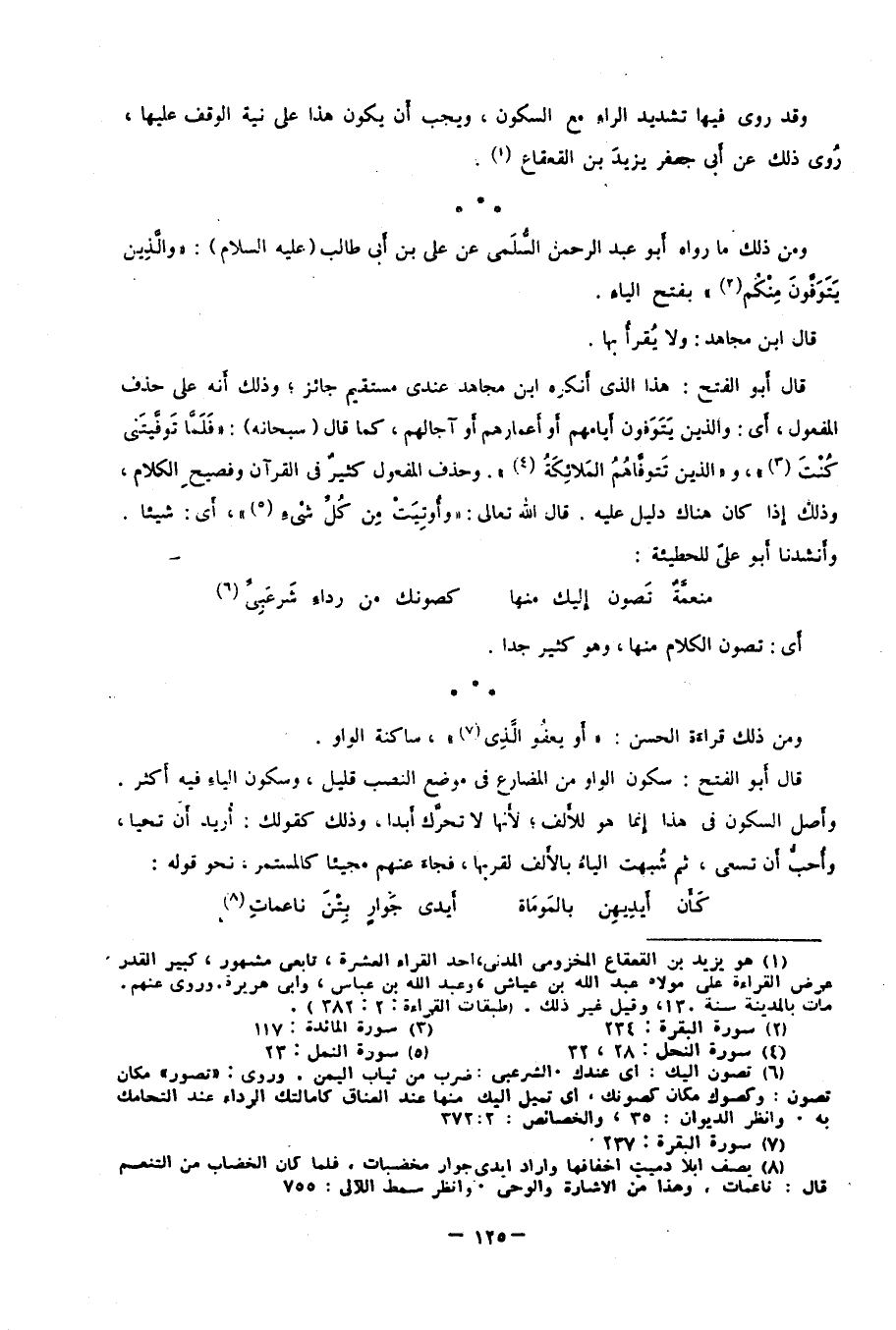 قال أبو الفتح: هذا الذي أنكره ابن مجاهد عندي مستقيم جائز؛ وذلك أنه على حذف المفعول؛ أي: والذين يتوفون أيامهم أو أعمارهم أو آجالهم، كما قال "سبحانه": {فَلَمَّا تَوَفَّيْتَنِي كُنْتَ} 3، و {الَّذِينَ تَتَوَفَّاهُمُ الْمَلائِكَةُ} 4، وحَذْفُ المفعول كثير من القرآن وفصيح الكلام، وذلك إذا كان هناك دليل عليه، قال تعالى: {وَأُوتِيَتْ مِنْ كُلِّ شَيْءٍ} 5 أي: شيئًا، وأنشدنا أبو علي للحطيئة: