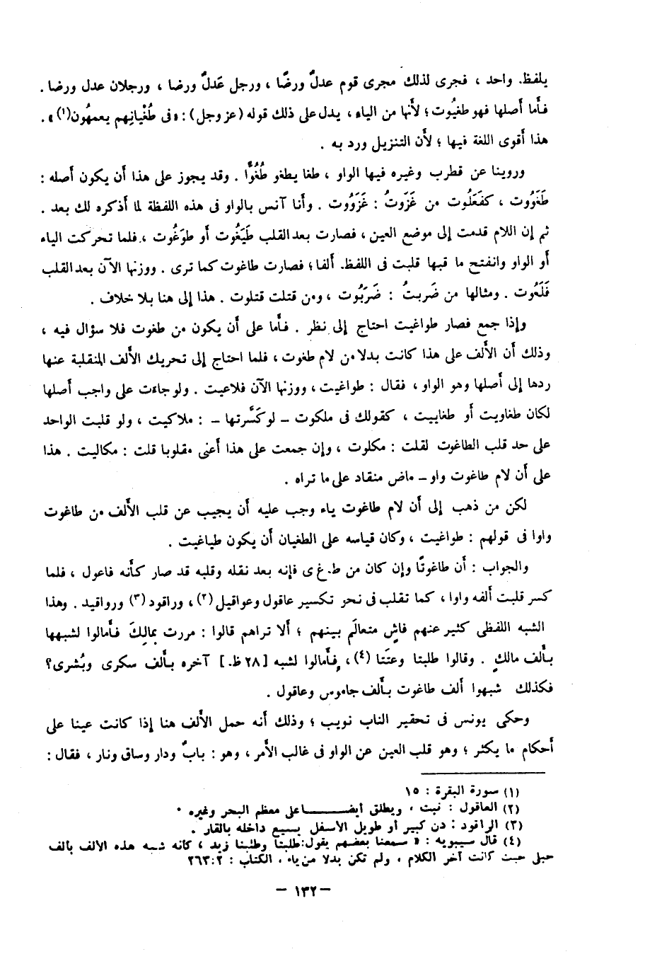 والجواب: أن طاغوتًا وإن كان من ط غ ى فإنه بعد نقله وقلبه قد صار كأنه فاعول، فلما كسر قلبت ألفه واوًا كما تقلب في نحو تكسير عاقول وعواقيل2، وراقود3 ورواقيد، وهذا الشبه اللفظي كثير عنهم فاشٍ متعالَم بينهم؛ ألا تراهم قالوا: مررت بمالِكَ فأمالوا لشبهها بأَلف مالكٍ، وقالوا: طلبتا وعتَتا4، فأمالوا لشبه "28ظ" آخره بألف سكرى وبشرى؟ فكذلك شبهوا ألف طاغوت بألف جاموس وعاقول.
