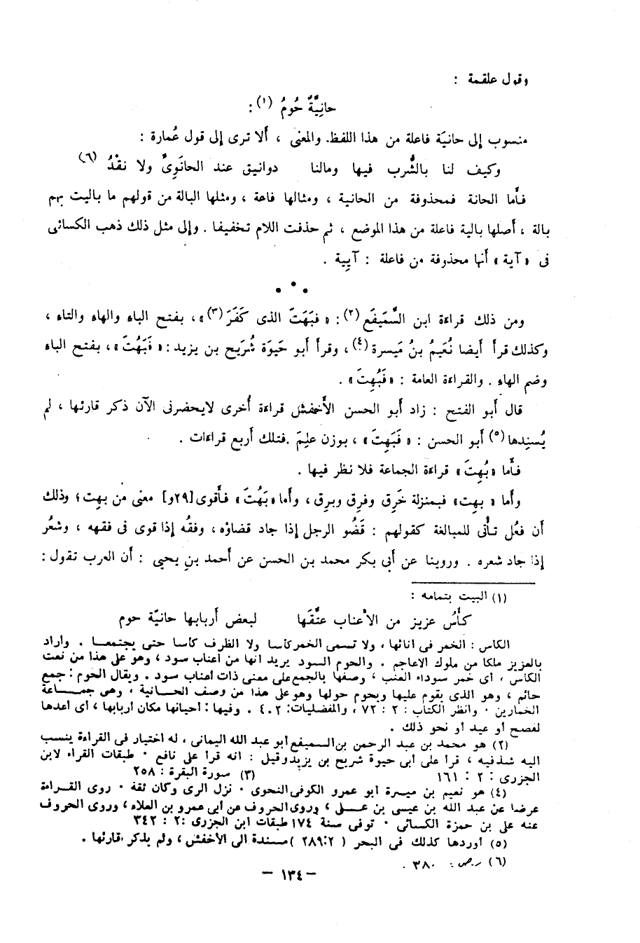 الكأس: الخمر في إنائها، ولا تسمى الخمر كأسًا ولا الظرف كأسًا حتى يجتمعا، وأراد بالعزيز ملِكًا من ملوك الأعاجم، والحوم السود يريد أنها من أعناب سود، وهو على هذا من نعت الكأس؛ أي: خمر سوداء العنب، وصفها بالجمع على معنى ذات أعناب سود، ويقال الحوم: جمع حائم؛ وهو الذي يقوم عليها ويحوم حولها وهو على هذا من وصف الحانية، وهي جماعة الخمارين. وانظر: الكتاب: 2/ 72، والمفضليات: 402، وفيها: "أحيانها" مكان "أربابها"؛ أي: أعدها لفصح أو عيد أو نحو ذلك.