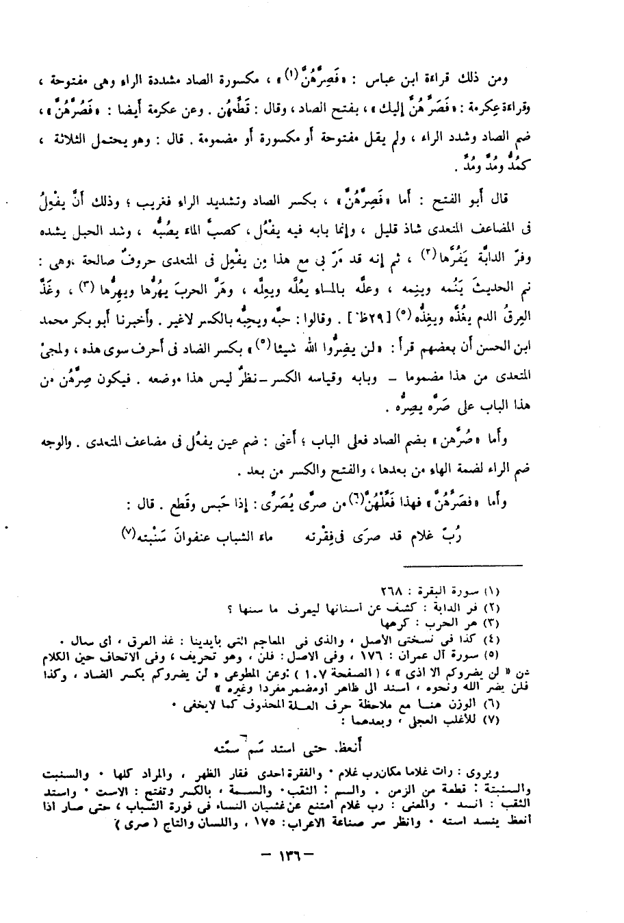 قال أبو الفتح: أما "فَصِرَّهُنَّ" بكسر الصاد وتشديد الراء فغريب؛ وذلك أن يفْعِل في المضاعف المتعدي شاذ قليل، وإنما بابه فيه يفْعُل، كصَبَّ الماء يَصُبُّه، وشد الحبل يشده، وفرَّ الدابة يفرها2، ثم إنه قد مر بي مع هذا مِن يفْعِل في المتعدي حروف صالحة؛ وهي: ثم الحديث يَنُمه ويَنِمه، وعلَّه بالماء يعُلَّه ويعِلَّه، وهَرَّ الحرب يهُرُّها ويهِرُّها3، وغَذَّ العِرقُ الدم يغُذه ويغِذه4 "29ظ". وقالوا: حبَّه ويحِبُّه بالكسر لا غير، وأخبرنا أبو بكر محمد بن الحسن أن بعضهم قرأ: "لن يَضِرُّوا الله شيئًا"5 بكسر الضاد في أحرف سوى هذه، ولمجيء المتعدي من هذا مضمومًا -وبابه وقياسه الكسر- نَظَرٌ ليس هذا موضعه، فيكون صِرَّهُن من هذا الباب على صَرَّه يصِرُّه.