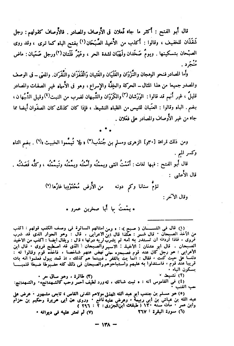 وأما المصادر فنحو الوهجان والنَّزَوَان والغَلَيَان والغثيان والقفزان والنقران. والمعنى -في الوصف والمصدر جميعًا من هذا المثال- الحركة والخفة والإسراع، وهو في الأسماء غير الصفات والمصادر قليل، غير أنهم قد قالوا: الوَرَشان3 والكَرَوَان والشبهان لضرب من النبت4، وقيل: الشَّبُهان بضم الباء، وقالوا: العنَبان للتيس من الظباء النشيط، فإذا كان كذلك كان الصفَوان أيضًا مما جاء من غير الأوصاف والمصادر على فعَلان.