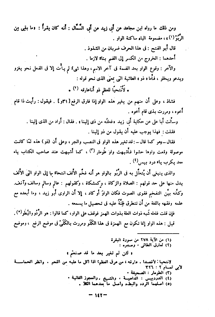 والآخر: وقوع الواو بعد الضمة في آخر الاسم، وهذا شيء لم يأتِ إلا في الفعل نحو: يغزو ويدعو ويخلو، فأما "ذو" الطائية التي بمعنى الذي نحو قوله: